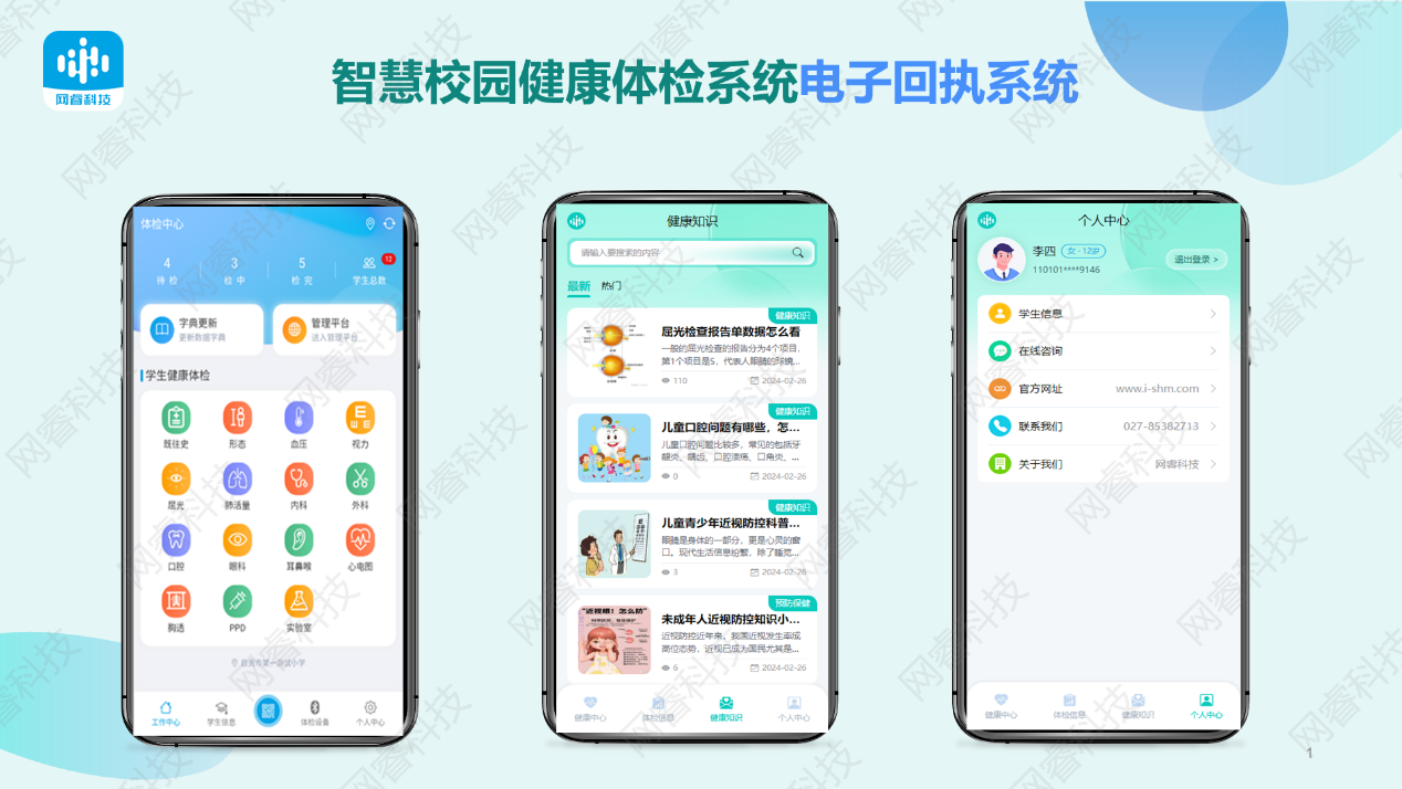 网睿《智慧校园健康体检系统》的电子回执系统,家长可登陆,查询学生历年历次的体检数据、主检报告、健康建议。另外,学校还可在体检前后,向学生及家长发送相关科普知识、管理要求、政策文件,充分满足家长的知情关注。