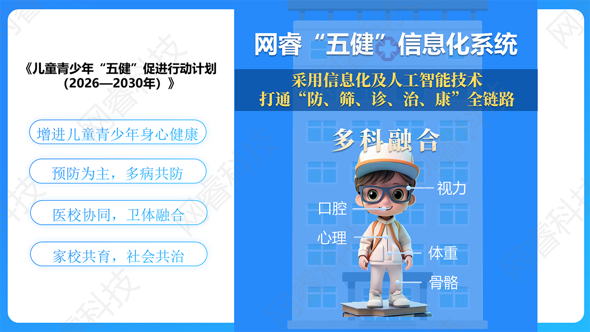 2025年12月,国家多部门联合印发《儿童青少年“五健”促进行动计划(2026—2030年)》,要求加强儿童青少年肥胖、近视、心理行为异常、脊柱弯曲异常和龋齿等防治,促进儿童青少年体重、视力、心理、骨骼、口腔健康;加强信息化建设,探索应用数智技术,科学评估儿童青少年健康状况,实施分级分类精细化管理,提升健康服务水平。